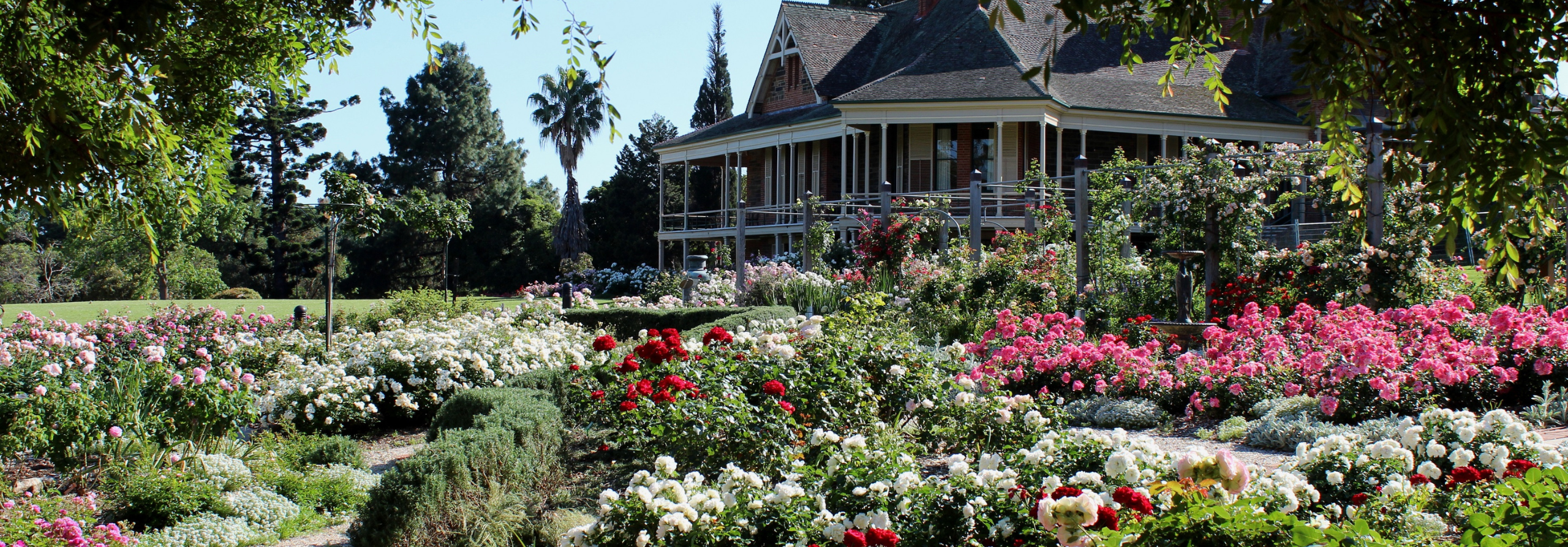 The house later became a convalescent home and, after decades of decline, fell into disrepair. Its revival began in 2000 when Bob Wallis and his daughter Michelle purchased the property and five acres of land. Inspired by its potential, they undertook a meticulous restoration, returning both the mansion and gardens to their former splendour. Roses link the gardens into a romantic unified design. The garden design today interprets the cultural and historical importance of the property where themed gardens have links with the past, reminiscent of the people who lived and worked there.